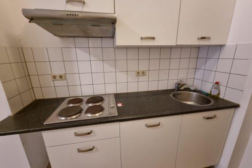 De studio beschikt over een lichte en ruime woonruimte met open keuken. De keuken is voorzien van inbouwapparatuur, waaronder een koelkast, kookplaat, afzuigkap en voldoende kastruimte.